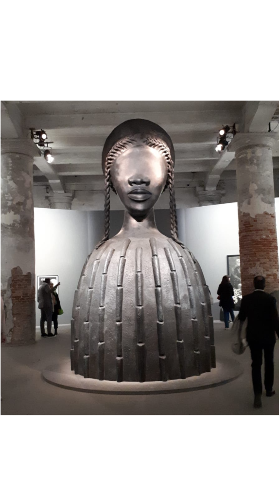 On the day of the Irish pavilion launch at the Arsenale building, there was a large queue snaking around the street corner. Of course, it had to rain! Inside, the Arsenale complex is a cavernous L-shaped industrial building that used to be a rope factory, with brickwork, columns and a beamed wooden roof. The first thing to encounter is a powerful 4.9m bronze figure by American artist Simone Leigh. Fittingly titled Brick House (originally created for 10th avenue, Manhattan, in 2019), this piece continues  Leigh’s theme of the female body as a site of multiplicity by this eyeless female figure whose upper body recalls traditional African mud-hut buildings. Historically, Leigh is one of the first two black women ever to have been awarded the prestigious Golden Lion Award for best Arsenale exhibit this year, with British artist Sonia Boyce being awarded for best Pavilion in the Giardini.