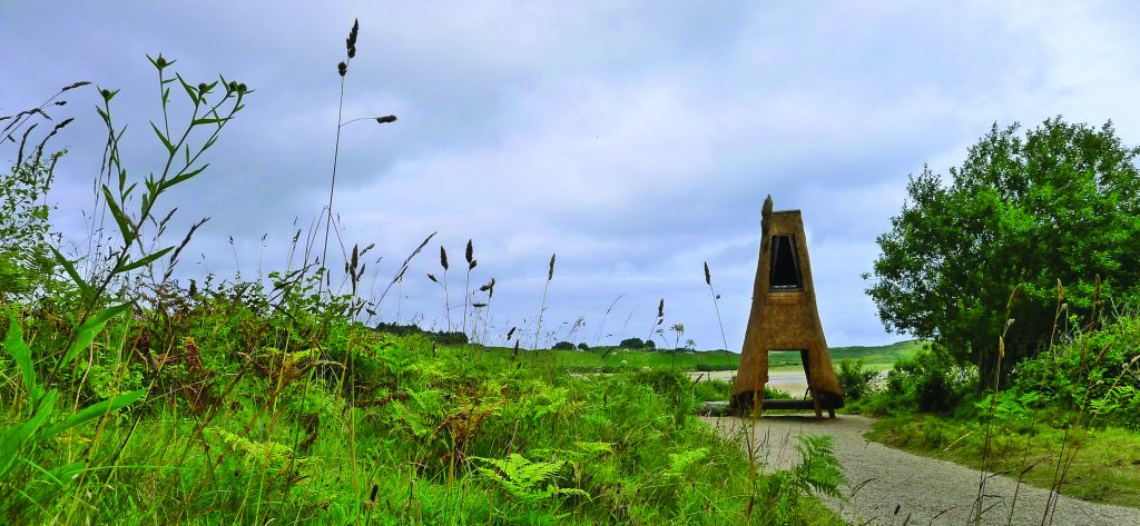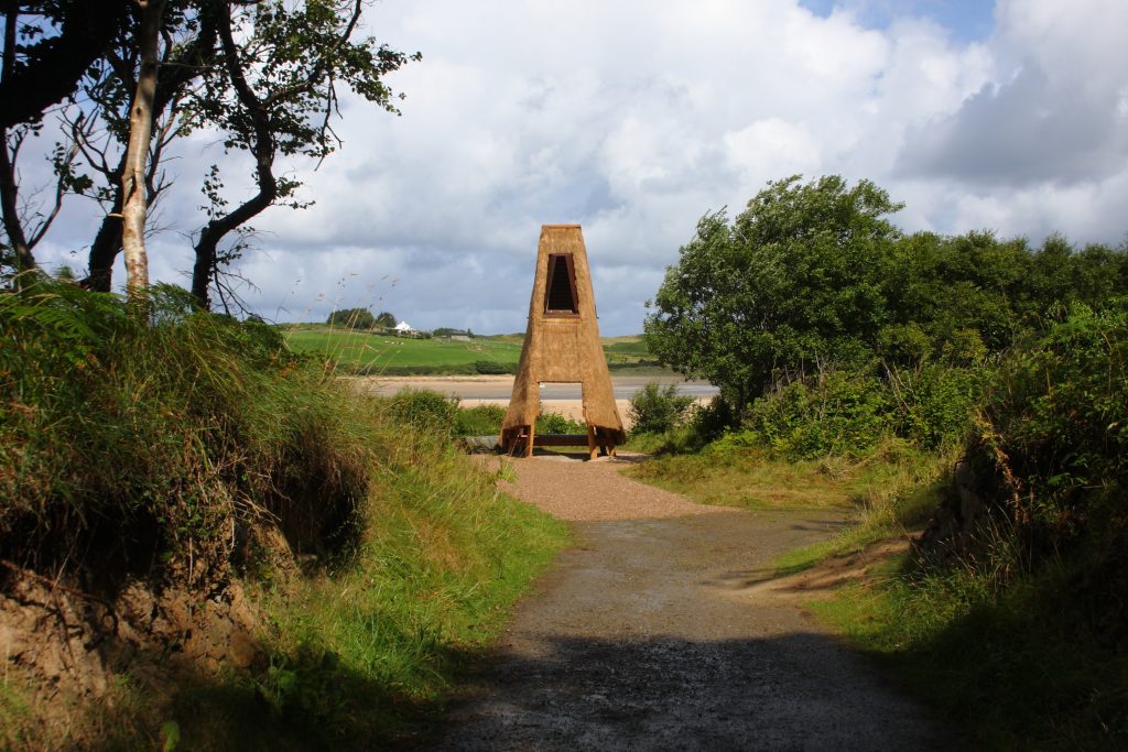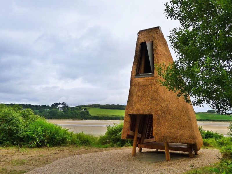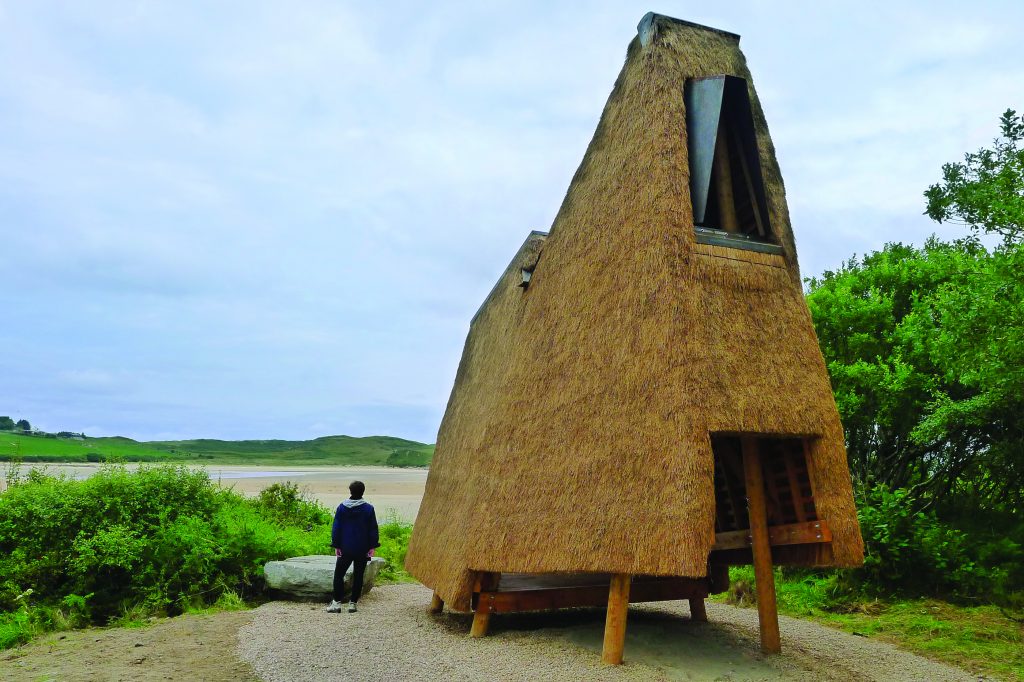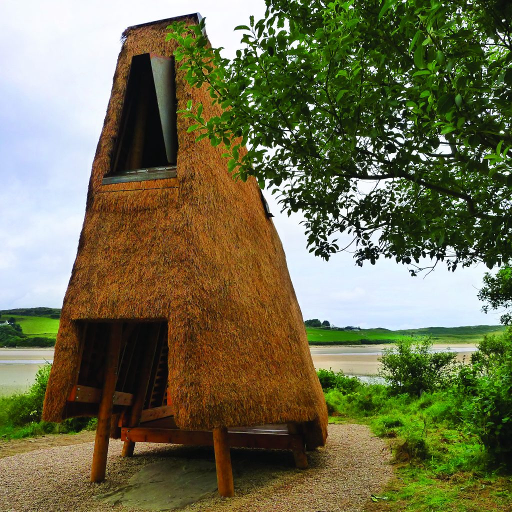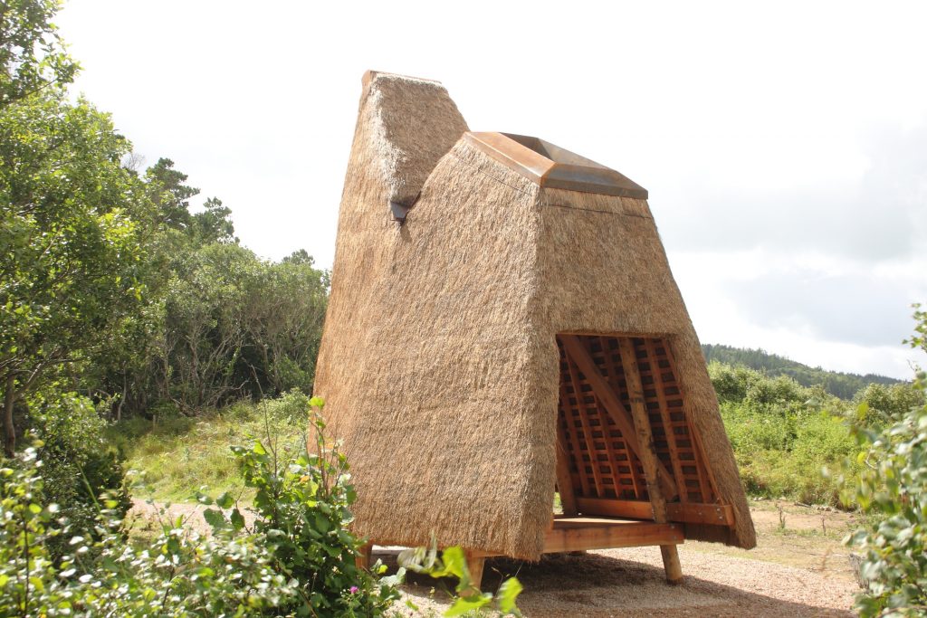 ‘Jeffry’s House’ by architect Thomas O’Brien and artist Emily Mannion, with thatcher Ivor Kilpatrick and carpenter Nick Russel, is a folly made from thatch on a wooden frame, named after Jeffry’s Lough, a nearby lake which appears on older maps but has now disappeared. Standing at the edge of the forest, ‘Jeffry’s House’ offers shelter and views of the sea, sand dunes and mountains beyond. Sensitive to the natural beauty of the landscape around it, the structure combines traditional thatching with a slender geometric form and is designed to allow nature to reclaim the ground beneath.